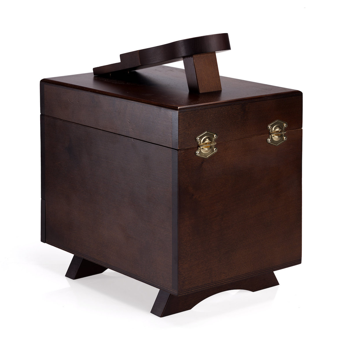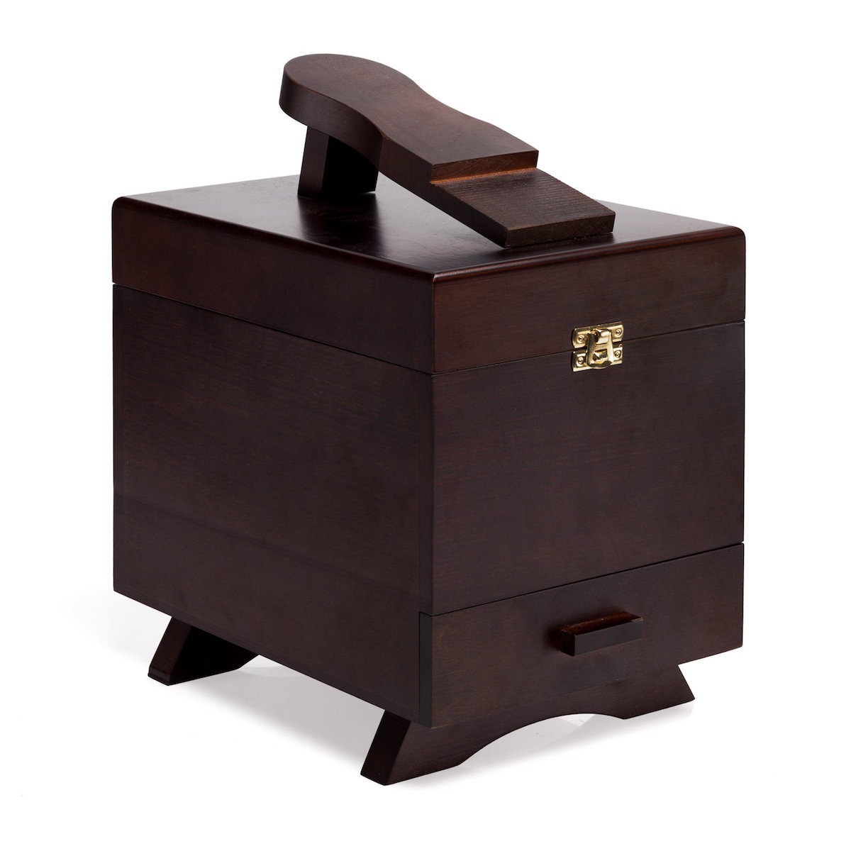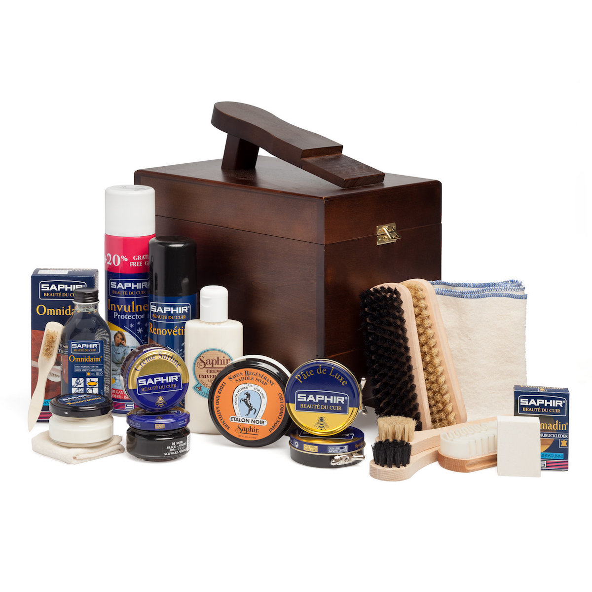 Его основой является добротный и стильный деревянный ящик, оснащённый крышкой на удобном замке и несколькими отделениями. В ящике находятся две средние щётки для чистки ботинок, две небольшие щётки для нанесения крема и некоторых других средств, тканевая салфетка и несколько полезных средств французской марки Saphir: