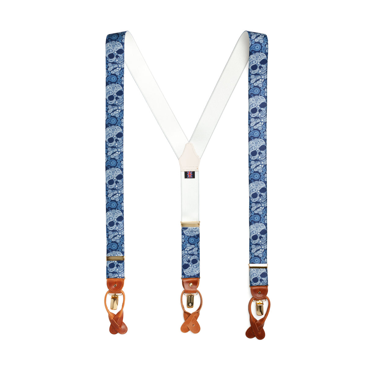 Albert Thurston Blue Skulls — это добротные и удобные подтяжки английского производства, сшитые из очень прочной синтетической ткани в голубой цвет с узором "черепа".