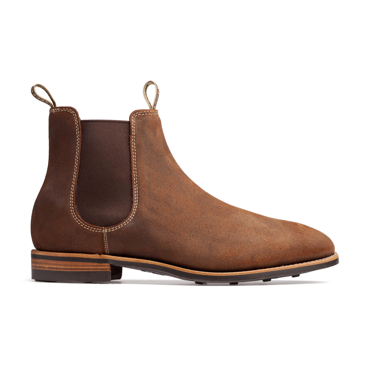 Верх челси Barker Mansfield Mid Brown Waxy Suede сделан из вощёной (жированной) замши. Имейте в виду, что она отличается от обычной замши внешним видом и свойствами. Выглядит она менее формально, менее элегантно и менее благородно, но зато обладает большей устойчивостью к воздействию влаги и в целом более практична. Резиновые подошвы от марки Dainite тоже смело можно назвать практичными; что же касается конструкции Goodyear welted, в которой сшиты эти ботинки Barker, то она пользуется большим уважением среди знатоков хорошей обуви благодаря износостойкости, надёжности и продуманности.