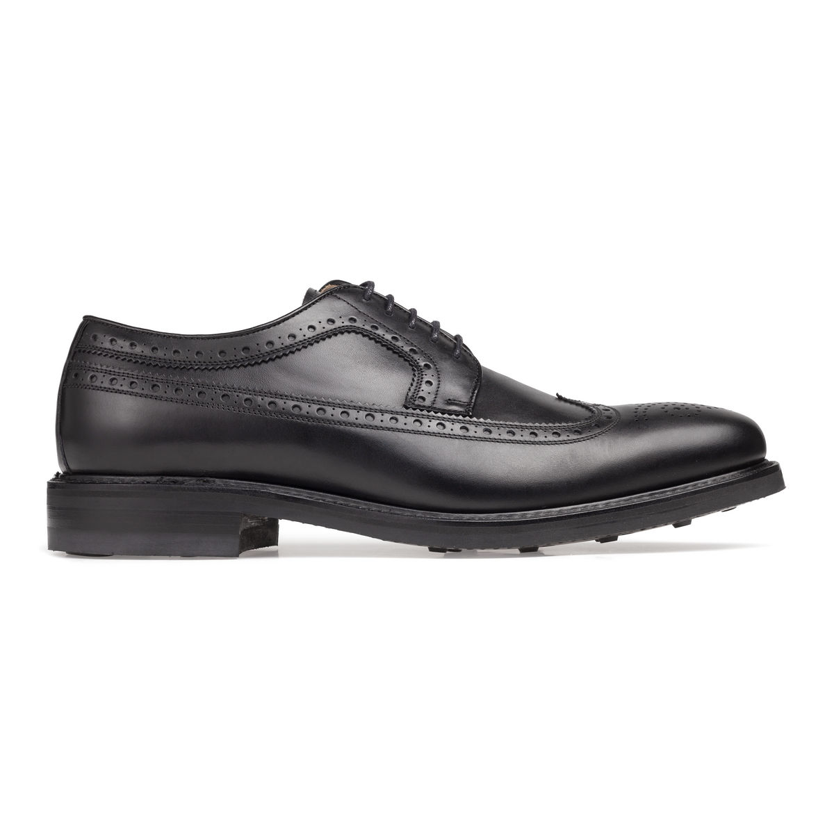 Finsbury Barton Black — это чёрные лонгвинг блюхеры, то есть туфли с открытой шнуровкой и длинными прямыми боковыми швами. Кроме того, они являются ещё и полными брогами, так что уровень их официальности невысок. Степень универсальности при этом заслуживает похвал, потому что такие туфли гармонируют и с неформальными костюмами, и с джинсами, и со множеством непарных брюк, включая как модели из твида и фланели, так и популярные ныне чиносы (в том числе без стрелок).