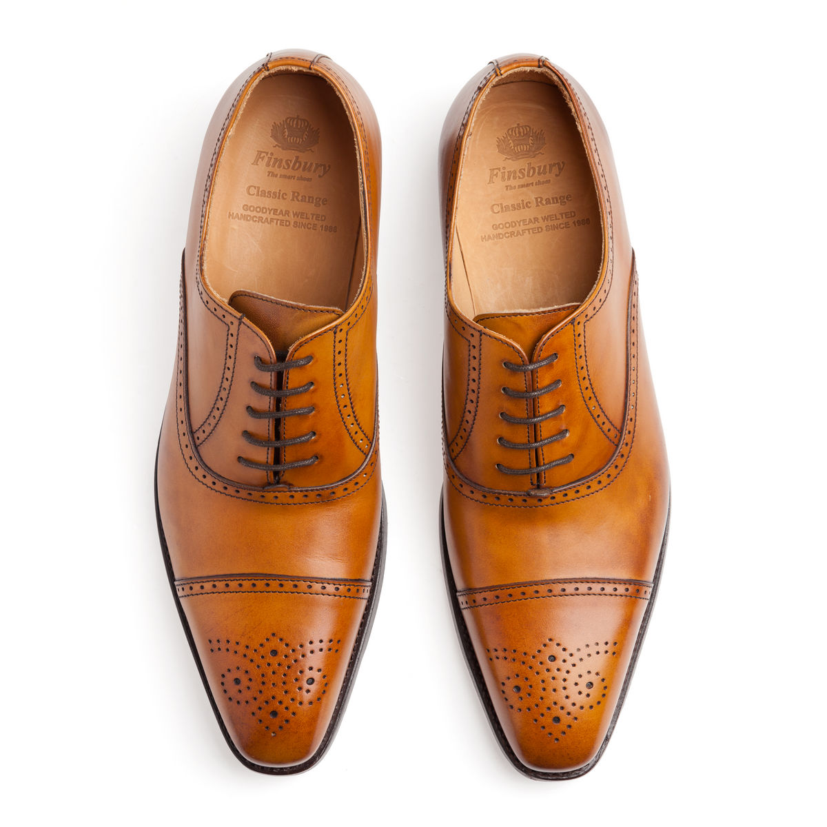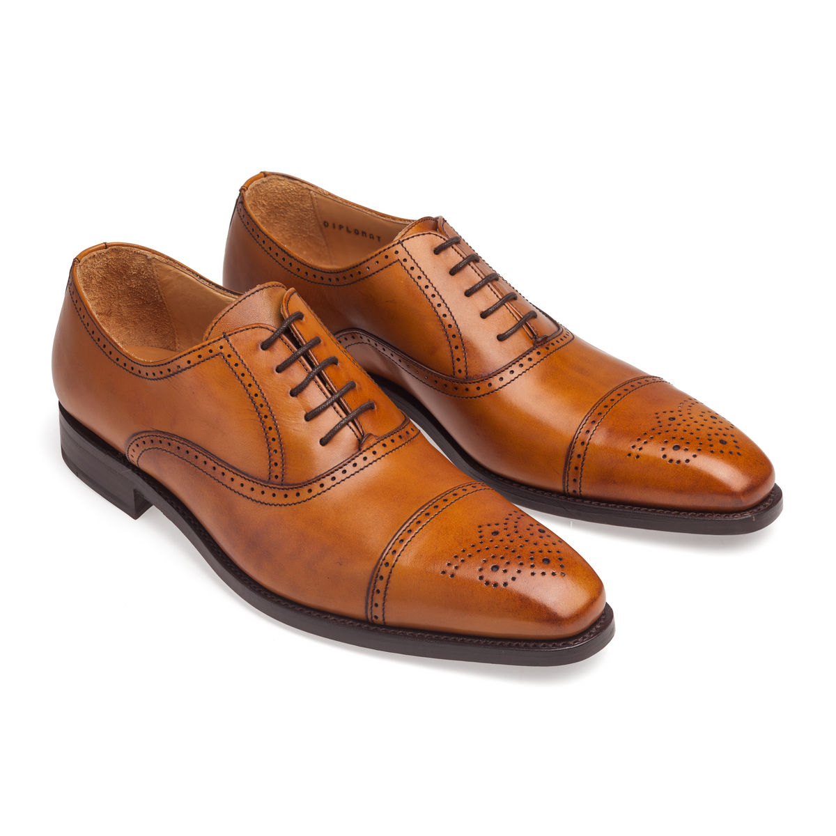 Finsbury Diplomat Yellow — это элегантные оксфорды-аделаиды (adelaide oxfords), то есть оксфорды без боковых швов. Кроме того, эти туфли являются брогами — или, если быть совсем точным, полуброгами (half brogues). Декоративные дырочки на них размещены вдоль всех швов, а также на мыске — в виде своеобразного узора, называемого медальоном.